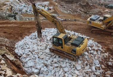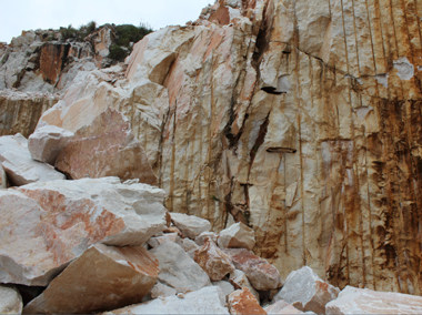 圖4 這種礦體,因為裂紋比較多,不適合做天然大理石板材,就成為碳酸鈣粉體的好材料。通過打孔放置炸藥,將礦山炸成左下角大塊狀石頭。