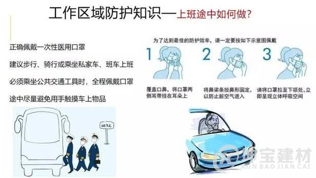正確佩戴一次性醫用口罩。盡量不乘坐公共交通工具,建議步行、騎行或乘坐私家車、班車上班。如必須乘坐公共交通工具時,務必全程佩戴口罩。途中盡量避免用手觸摸車上物品。