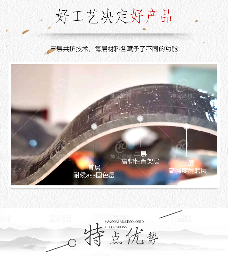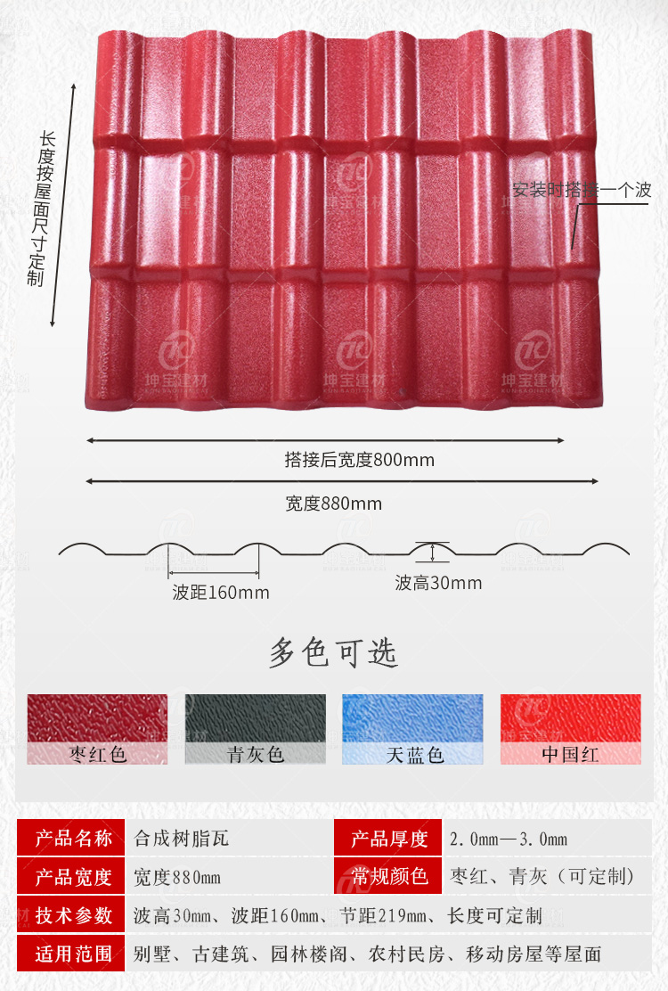 《坤寶牌》合成樹脂屋面瓦,原料采用高耐候性ASA樹脂研制,中間是發(fā)泡隔熱骨架層,底層為高強(qiáng)度耐磨層。防腐耐候性能**,承載力好,能夠抵擋酸堿鹽侵蝕,化工廠房及污染惡劣環(huán)境都適用。由于合成樹脂屋面瓦屬于高分子聚合物,本身瓦面就致密不吸水,大大提升防水效果,而且具有荷葉效應(yīng),灰塵雜物等不容易堆積在屋面上,減輕了瓦面的負(fù)擔(dān)及房梁的承重,還可延長了合成樹脂屋面瓦的使用壽命。