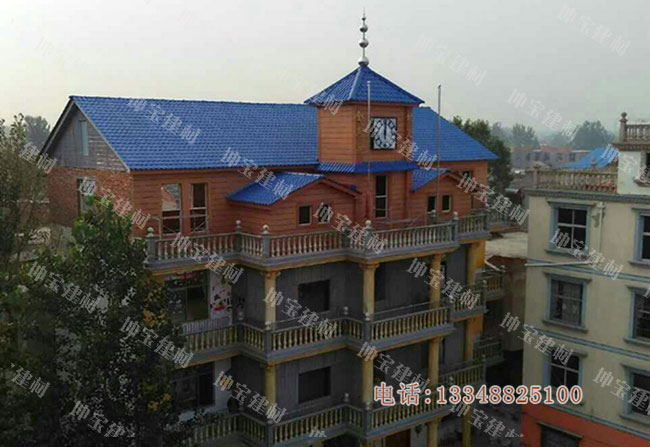 甘肅某地金蘋果幼兒園通過總體規劃和申報,獲批擴建一層樓,為了更好的隔熱和防滲漏,采用坡屋頂加蓋瓦的建筑形式, 屋面材料 就是選用的藍色 ASA合成樹脂瓦 ,外墻裝修材料是泥土色的掛壁板。所有建材均屬于環保節能新型產品,無污染,無有害物質釋放,以保